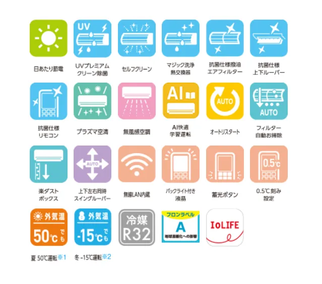 アプリ対応:専用アプリ「IoLIFE」を使って、エアコンの操作や温度・湿度の確認が可能です。